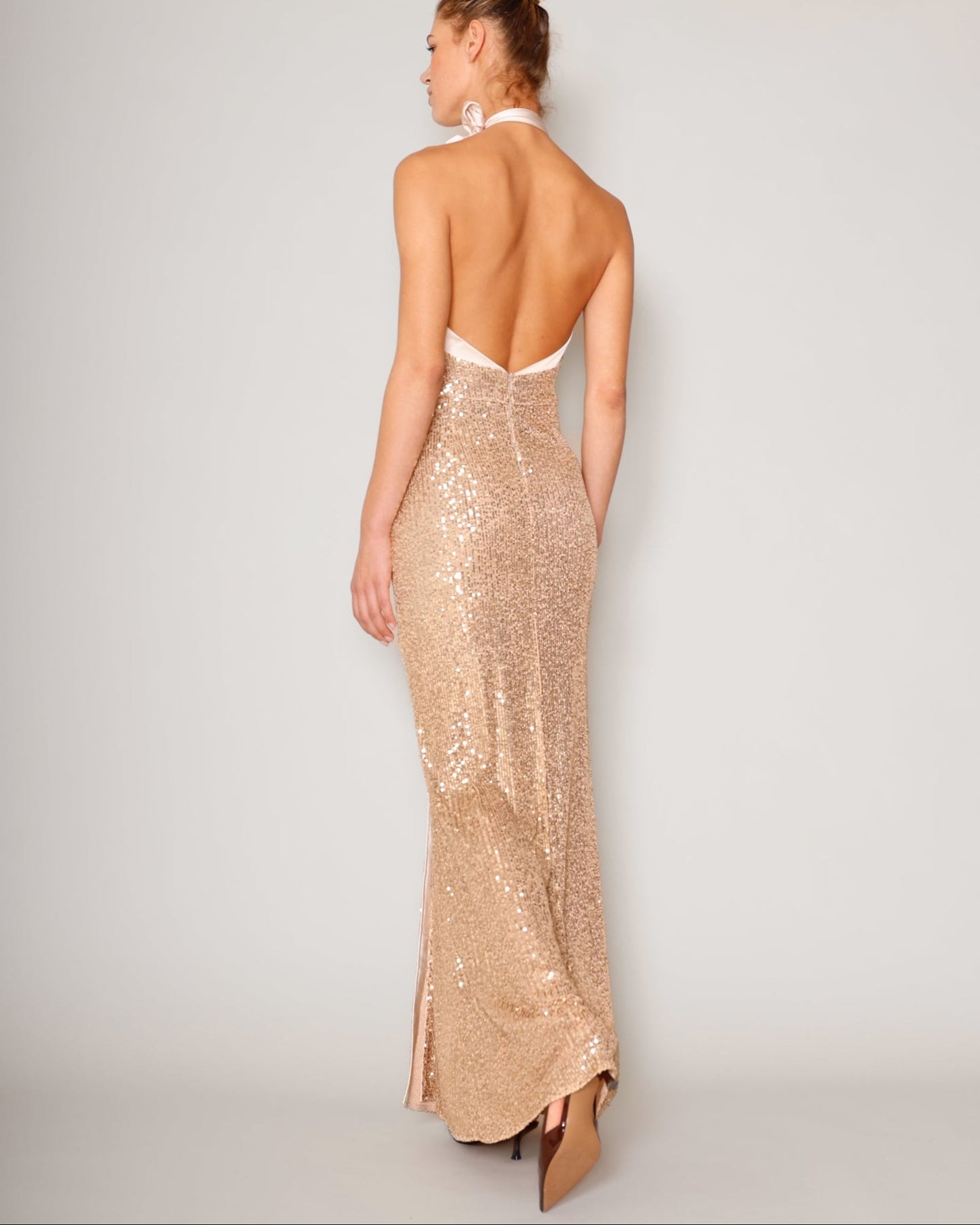 Goldenes Paillettenkleid, glitzernd und glamourös, mit tiefem Rückenausschnitt und hohem Beinschlitz. Die Drapes im Taillen- und Hüftbereich sowie der Stretchanteil im Stoff sorgen für eine perfekte Passform. Fishtail Silhouette, im Rückteil etwas länger als vorne. Besonders edel: Der Ausschnitt ist mit Satin eingepaspelt, langes Bindeband am Halsausschnitt.