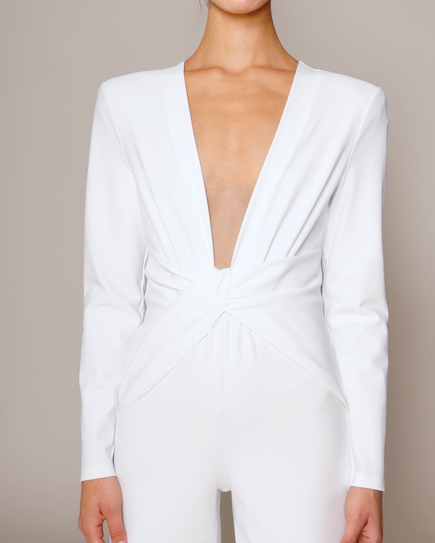 Körperbetonter Catsuit aus gebondetem Jeresy (hohe Elastizität, etwas dickeres Material) Shaping Effekt. Mit hautfarbenem Tüll gefüttert, daher absolut blickdicht. Der tiefe Ausschnitt ist mit feinem nude farbigem Tüll unterlegt, so kann er nicht aufspringen. Betonte Schultern durch Schulterpolster. Reißverschluss im Rückteil. Das ausgestellte Hosenbein macht optisch besonders lange Beine. Für die moderne Braut ein super Standesamt Look.