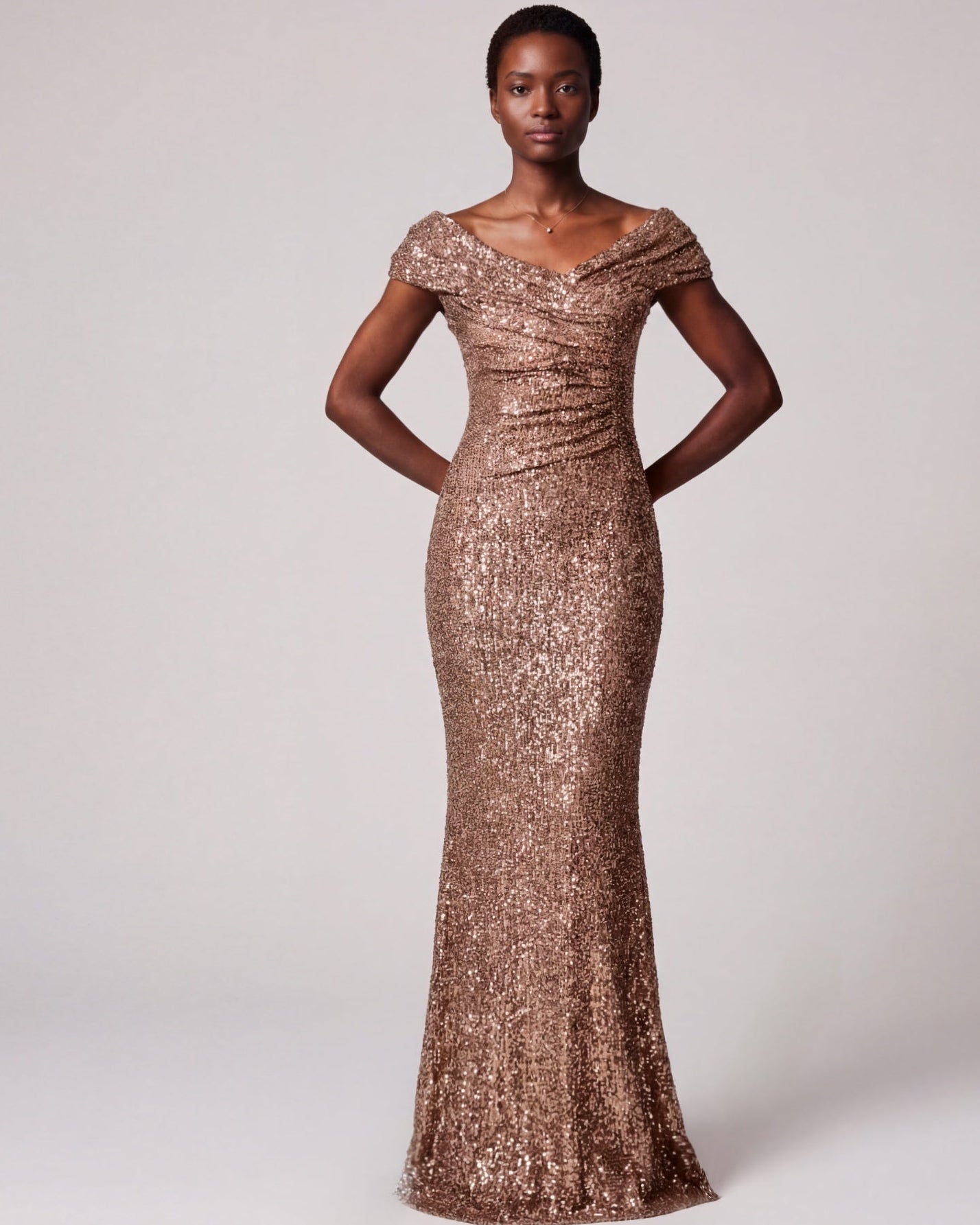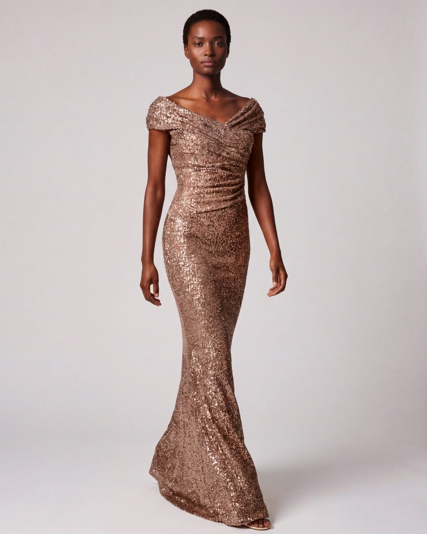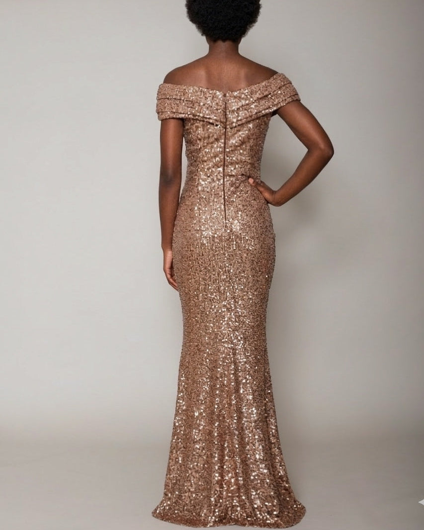 Langes Abendkleid, elastisch, aus glitzernden Pailletten. Perfekt gesetzte Drapierungen garantieren eine optimale Passform. Wunderschöne Meerjungfrauensilhouette, das Rockteil ist am Knie leicht eingestellt und geht in einen ausgestelltes Rockteil über. Das geraffte Oberteil setzt das Dekollete in Szene und passt sich durch seine Schnittführung jeder Körbchengrösse an.
